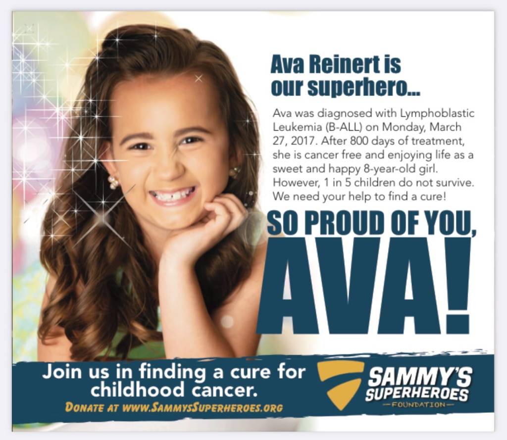 Walk or Run one mile anywhere this Saturday, May 8, to honor Ava in the Sammy’s Superheroes Walk To Remember!Your $10 donation raises money for childhood cancer research! CLICK HERE for more information!