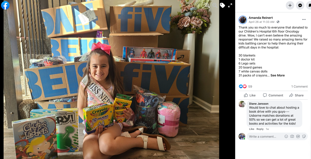 T-Shirts. Hash tags across social media. Fundraisers. Ava’s Army was seen across Omaha and Gretna, from gyms to schools, among family members and Amanda’s pageant sisters. And in December of 2019, Amanda hosted her first Sugarplum Ball, a formal dinner, auction and gala. Little girls (and big girls!) dressed up like real-life princesses for a night of glitter, fun and love for one another.