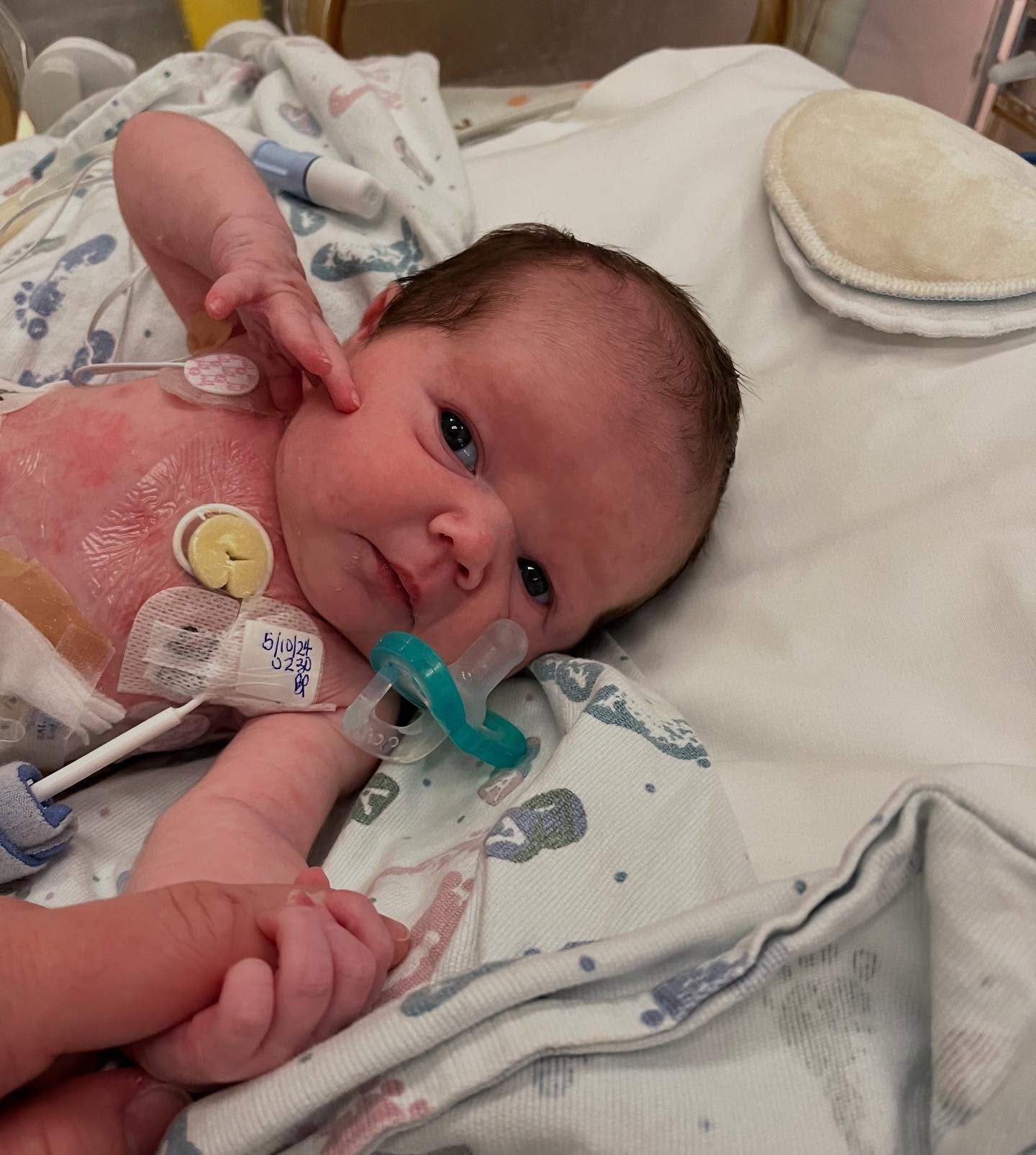 “We couldn’t pick her up and hold her for two weeks,” remembers Betsy. “This was to allow her dialysis catheter placement to heal. In this picture, she was 11 days old; I was so happy she was grabbing my finger!”